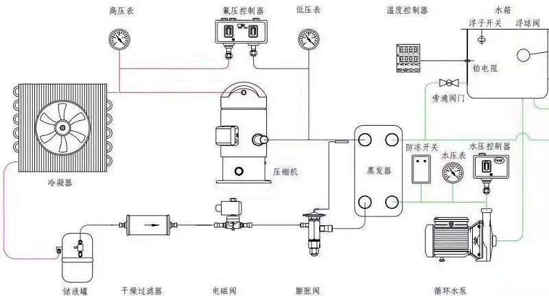 根據(jù)制冷系統(tǒng)原理,低溫低壓的液態(tài)冷媒在蒸發(fā)器里面與周圍水進行熱交換蒸發(fā)器吸收水的熱量,蒸發(fā)成低溫低壓的氣態(tài),蒸發(fā)過程中冷媒溫度不變,低溫低壓氣態(tài)的冷媒進入到壓縮機,經(jīng)壓縮機壓縮,被壓縮成高溫高壓的氣態(tài),然后進入冷凝器,在冷凝器里與室內(nèi)的介質進行熱交換,高溫高壓的氣態(tài)的部份熱量被介質吸收,介質溫度升高,冷媒放熱冷凝器變成高溫高壓液態(tài),冷凝器過程溫度不變,然后進入膨脹閥進行節(jié)流,節(jié)流是迅速降溫的過程,冷媒變成低溫低壓的液態(tài),此過程后的冷媒再進入到蒸發(fā)器進行換熱蒸發(fā),從而實現(xiàn)制冷系統(tǒng)的整個過程,這種循環(huán)是連續(xù)進行的,水才得以連續(xù)不斷的制冷。