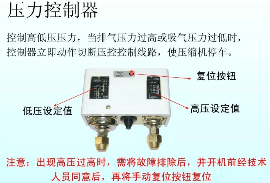 機(jī)械式壓力控制器屬于制冷機(jī)組壓力的控制的元器件,在制冷系統(tǒng)中主要用作高壓/低壓/高低壓壓力控制器。使用方法簡單,在壓力控制器上面設(shè)定一個(gè)壓力,以高于或者低于此壓力的壓力控制器觸點(diǎn)動(dòng)作,然后可以發(fā)出信號以保護(hù)制冷壓縮機(jī)為主。