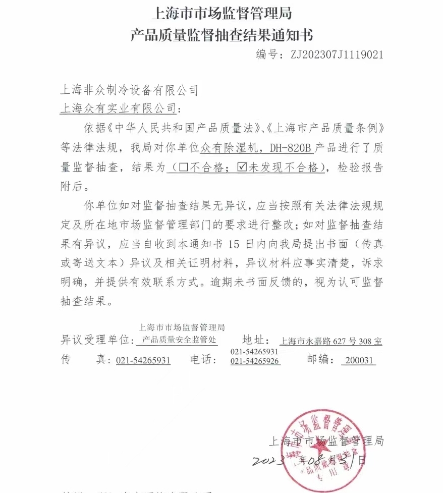 近日,上海市市場監督管理局依據《中華人民共和國產品質量法》、《上海市產品質量條例》等法律法規對上海眾有實業有限公司的除濕機系列產品進行了質量監督抽查,隨機抽查了DH-820B型號除濕機。此次抽查共檢驗了“對觸及帶電部件的防護”、“耐潮濕”、“發熱”等21項,報告顯示21項結果均為合格。