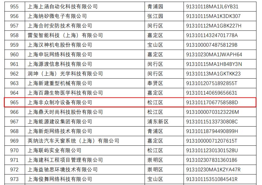近日,根據科技部、財政部、國家稅務總局《高新技術企業認定管理辦法》(國科發火〔2016〕32號)、《高新技術企業認定管理工作指引》(國科發火〔2016〕195號)、《上海市高新技術企業認定管理實施辦法》(滬科合〔2021〕21號)的有關規定,經審查,現將上海非眾制冷設備有限公司等4123家符合認定條件的企業擬認定高新技術企業名單(見附件)予以公示。